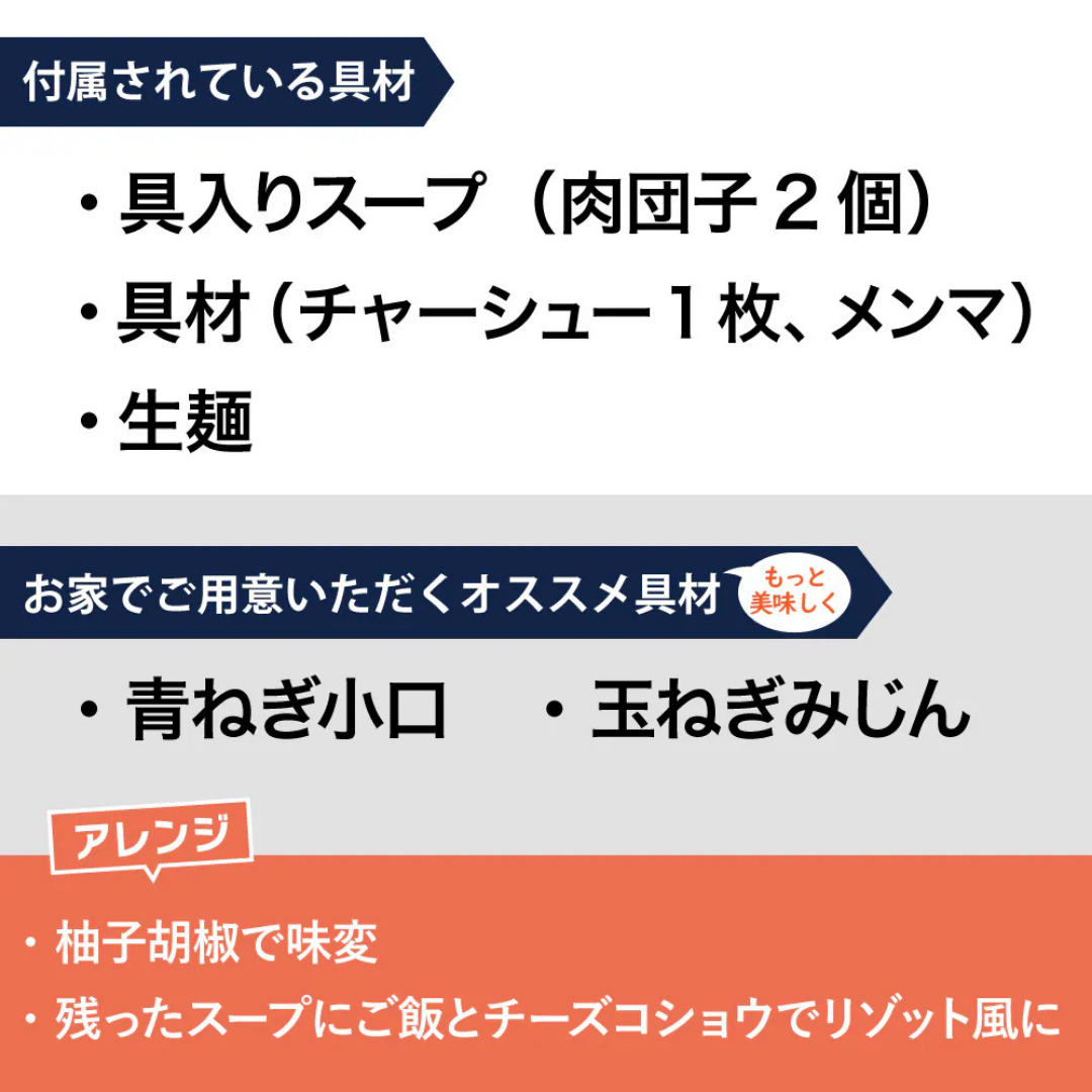 | 内容量: | 470g(めん140g) 商品同梱内容:具入りスープ(肉団子2個)、具材(チャーシュー1枚、メンマ)、生麺 |