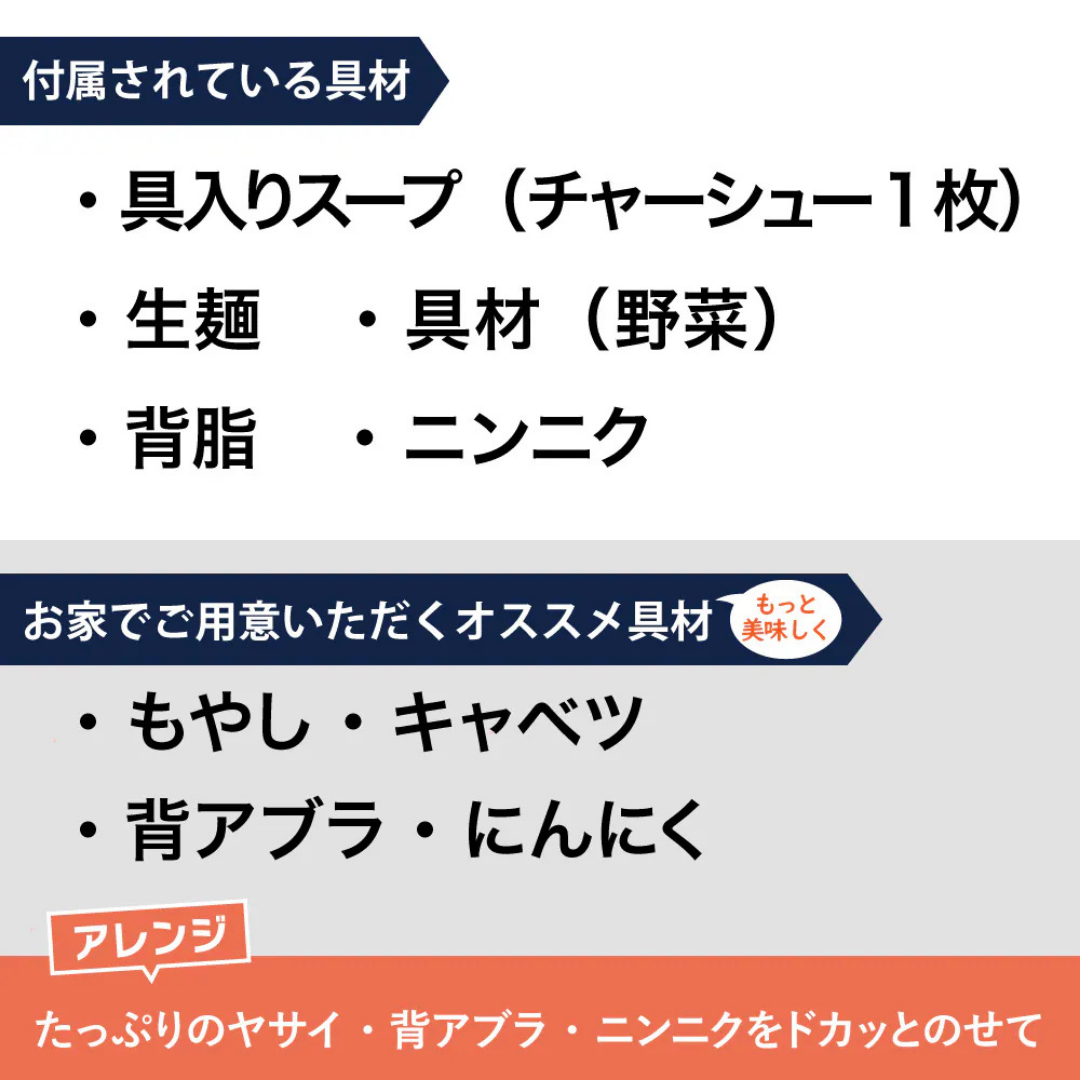 | 内容量: | 975g(めん250g) 商品同梱内容:具入りスープ(チャーシュー1枚)、生麺、具材(野菜)、背脂、ニンニク |