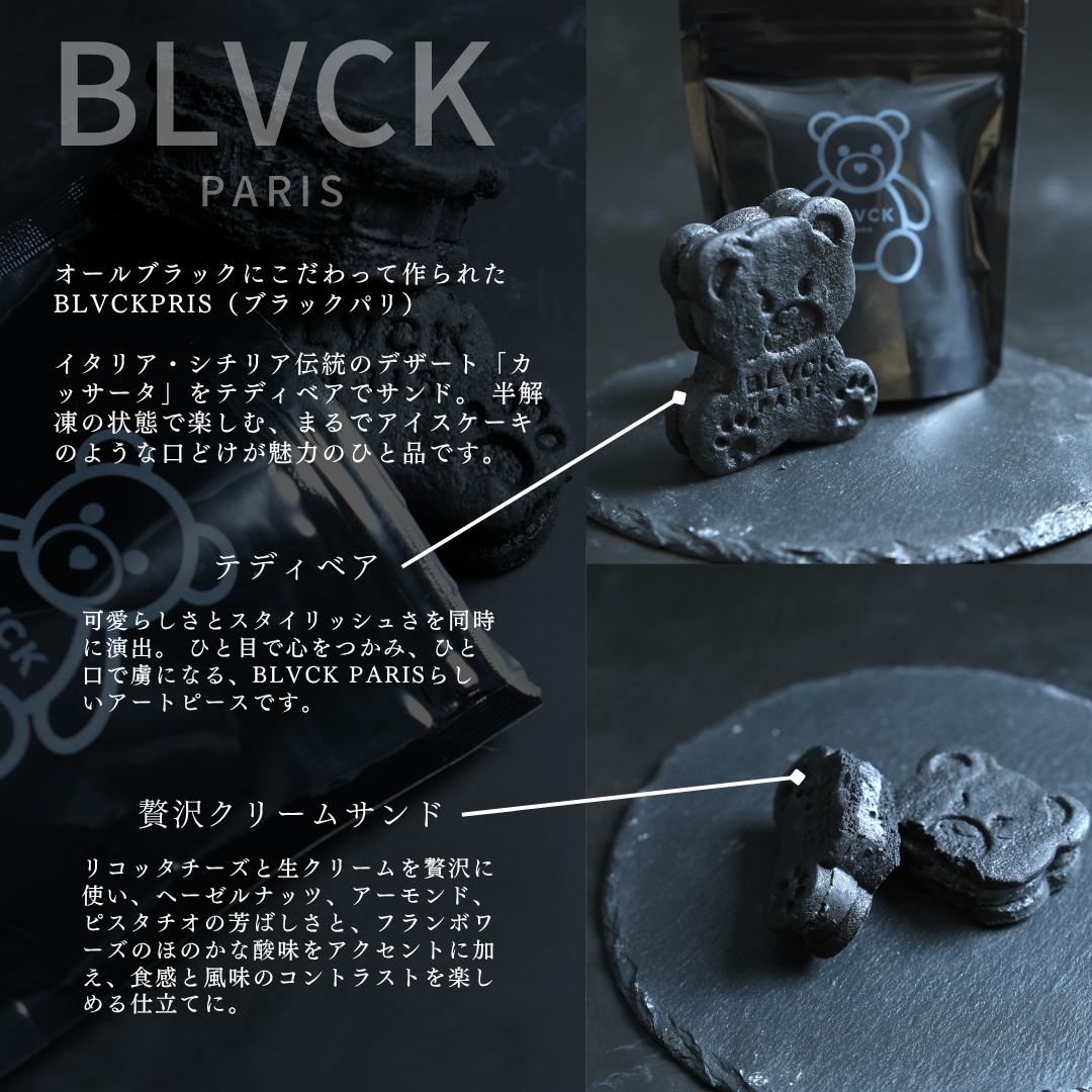 半解凍の状態で楽しむ、まるでアイスケーキのような⼝どけが魅⼒のアイスサンドです。“テディベア”のクッキーでサンドすることで、 可愛らしさとスタイリッシュさを同時に演出。 ひと目で⼼をつかみ、ひと⼝で虜になる、BLVCK PARISらしいアートピースです。