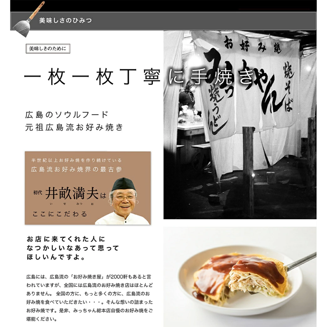 | 店舗紹介: | 戦後焼け野原だった広島の街の復興とともに、お好み焼のカタチが出来上がるまでには数々の歴史があります。 その物語の中心的な人物であり、広島の街に「お好み焼」を誕生させた“みっちゃん”こと井畝満夫(いせ みつお)。 広島の街にお好み焼を生み出した一人として、歴史を語り継ぎ、お好み焼を広島のソウルフードへと定着させました。 |