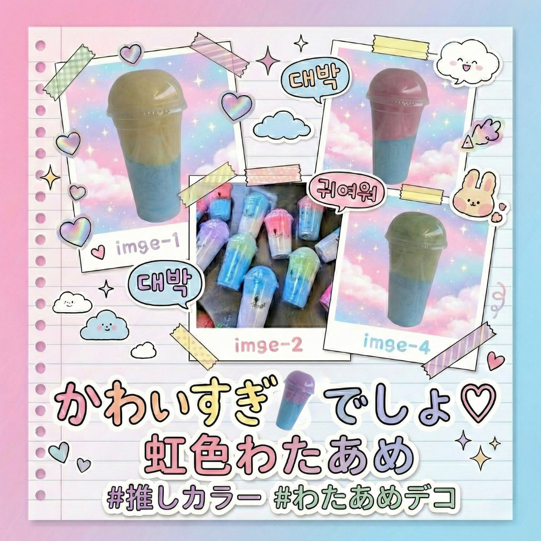 色によって違う味が楽しめるカラフルわたあめをカップに詰めました。ポップな見た目が売り場を目立たせます。今売っている販売商品に+1点追加で 売りやすくて売りやすい、置くだけでお店が華やかになります♪