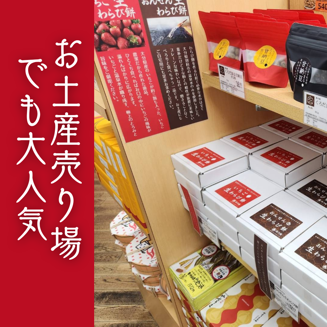 お土産売り場でも大人気!自家栽培の国産いちごを練りこんだ贅沢わらび餅!一口食べればお口の中にいちごの風味が あふれんばかりに広がります。「いちご」が3割も入った贅沢いちごのわらび餅です♪冷