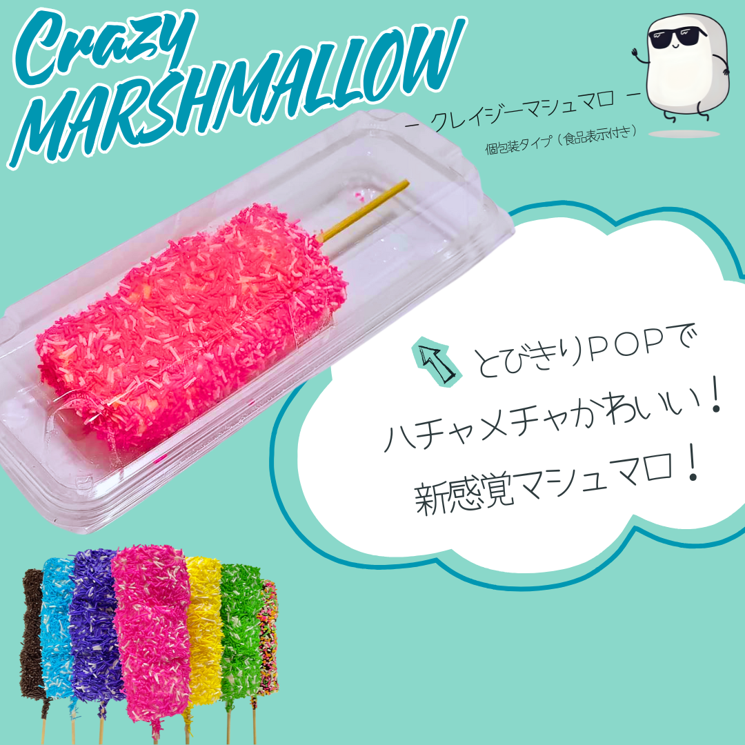 進化系クレイジーマシュマロは、スイーツ界の新星登場!マシュマロのふわふわ感と、色とりどりのチョコデコレーションはまるで1つのアート!トッピングの個性が爆発した、見た目の華やかさ&可愛さと、おいしさが両立した新感覚のスイーツです。お祭りや学園祭でなどでは、華やかさが求められます。このクレイジーマシュマロはその舞台にぴったり!カラフルな美しい見た目で、訪れる人々の目をしっかり惹きつけ、味覚だけでなく、視覚からも楽しむことができるのが、クレイジーマシュマロの大きな特徴です。お祭りや学園祭の主役となること間違いなし! さらに、SNSでのシェアがキモになる現在、美しくデコレーションされたクレイジーマシュマロは、インパクト抜群でインスタ映え間違いなし!フォロワーから「いいね!」を集め、SNSで話題になること間違いなしです。皆さんのイベントを盛り上げる強力な武器になることをお約束します!