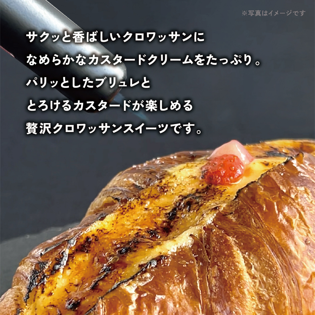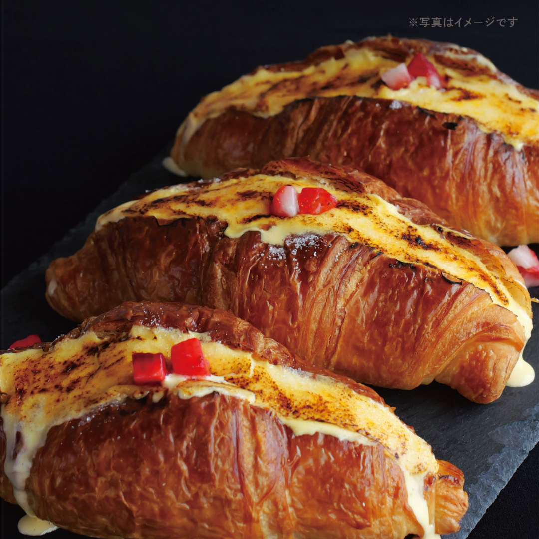 サクッと香ばしいクロワッサンになめらかなカスタードクリームをたっぷり。パリッとしたブリュレととろけるカスタードが楽しめる、贅沢クロワッサンスイーツです。