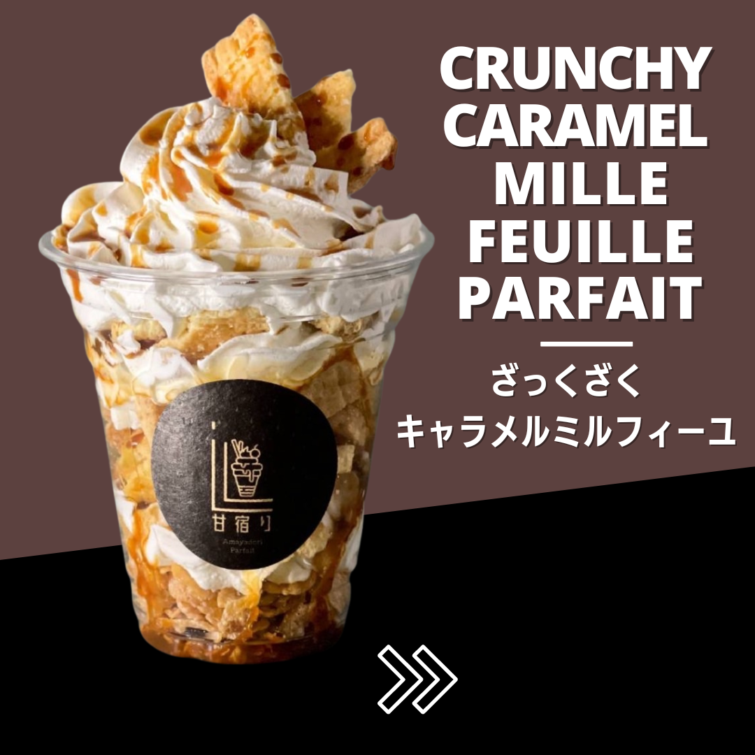 店舗紹介: | 一口食べるたびに幸せな気持ちに浸れるミルフィーユキャラメルパフェ。濃厚な味わいと歯ごたえを楽しんでください。身体の冷えた時や、気分を上げたい時にも最適な極上スイーツです。 |
