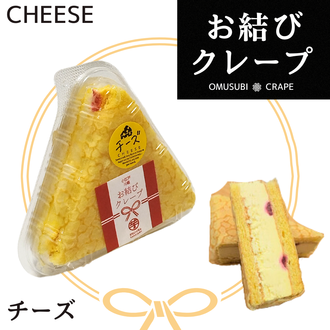 三角形のケーキをクレープで巻いた♪ご縁を結ぶ「OMUSUBI CPAPE」です♪濃厚なクリームチーズと甘酸っぱいラズベリーのソースがスポンジケーキにあわさった絶妙なおいしさ!【チーズケーキ】をワンハンドでお手軽にお楽しみいただけます♪